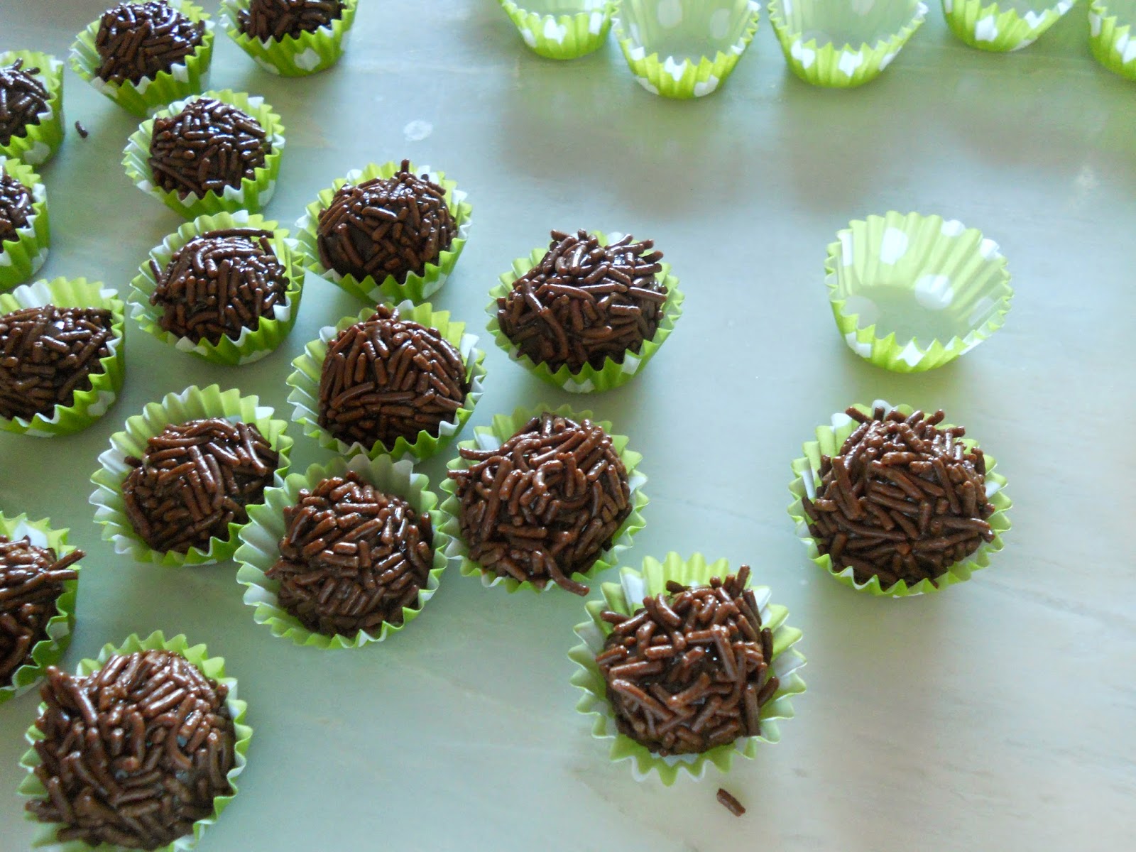 Unte as mãos com óleo ou margarina e depois de moldar uma bolinha, envolva-a em granulado de chocolate colorido e coloque na forma de papel :) depois de toda a massa moldada e envolta em granulado, leve ao frigorífico por umas horas para solidificarem convenientemente.