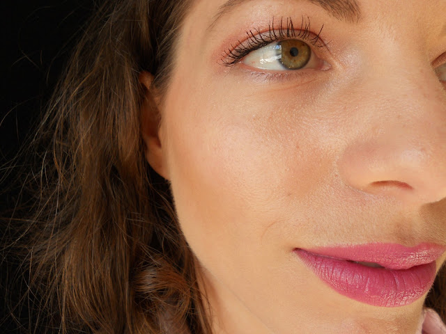 Quanto à maquilhagem de olhos e para seguir a linha de rosas do blush e batom, escolhi a paleta Naked 3. Usei a sombra Buzz esfumada no côncavo e canto externo, de seguida apliquei a Burnout em toda a pálpebra móvel e para iluminar o canto interno do olho usei a Dust. No arco da sobrancelha apliquei a Strange, não só para iluminar mas também para "levantar" o olhar. A máscara de pestanas eleita foi a Mega Volume Miss Manga, da L'Oréal (review aqui). Separa bem as pestanas, curva-as, dás-lhes volume e deixa-as bem pretas e marcantes.