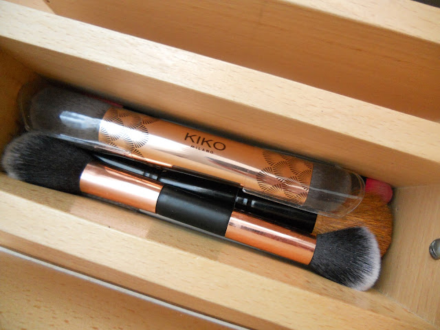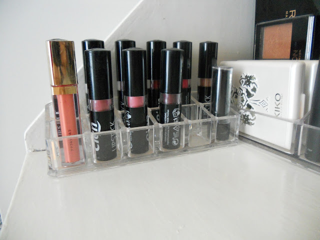 No acrílico que está por trás, guardo as paletas de blushes e bronzers da Makeup Revolution, o par de "cartas" da Kiko (um de um duo de blushes e outro de um duo de bronzer e iluminador), a paleta de contorno da Makeup Revolution, os três séruns que tenho da Kiko Milano e alguns batons da mesma marca.