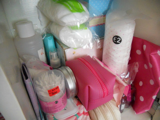 É no espaço resguardado pela porta que tenho o stock de discos de algodão, algumas bolsas de maquilhagem, stock de cotonetes de maquilhagem, toalhitas, o sabonete para lavar pincéis da Da Vinci, acetona e outras coisas menores.