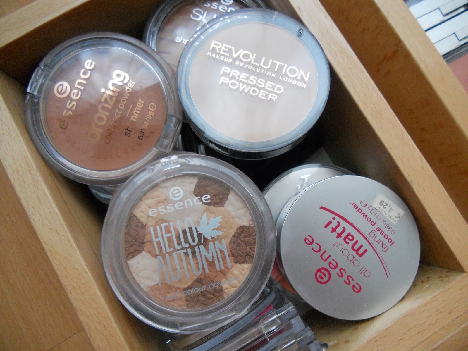 No "novo" móvel de madeira propriamente dito guardo nas duas gavetas de baixo, as maiores, de um lado pós compactos e soltos e bronzers, e do outro iluminadores e blushes. Na mesma gaveta encontro produtos novos, usados e em stock... mas na minha cabeça está tudo organizado acreditem.