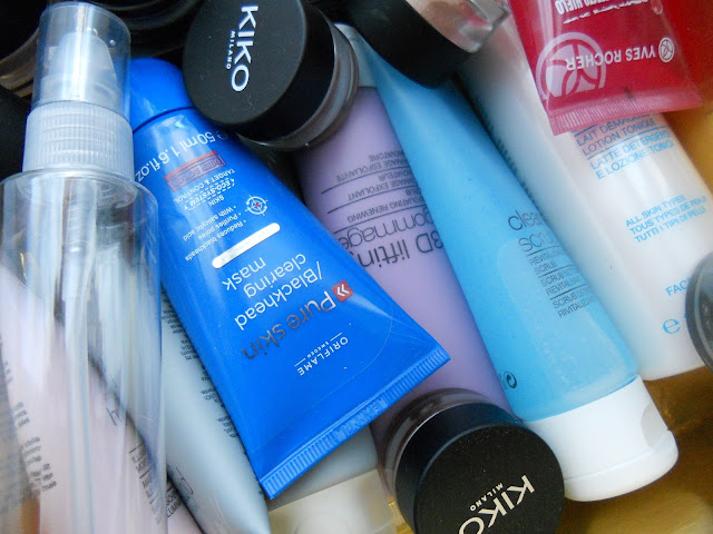 Na segunda caixa tenho sombras cremosas da Kiko que não têm lugar nos acrílicos e essencialmente máscaras faciais, embora vejam na foto também um desmaquilhante da Kiko, o Milk & Tone, que recomendo imenso.