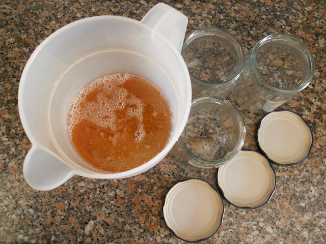 Depois de terminado o tempo, retirem o pau de canela, coloquem a "compota" ainda bem líquida num jarro, e distribuam-na pelos frascos já previamente esterilizados.