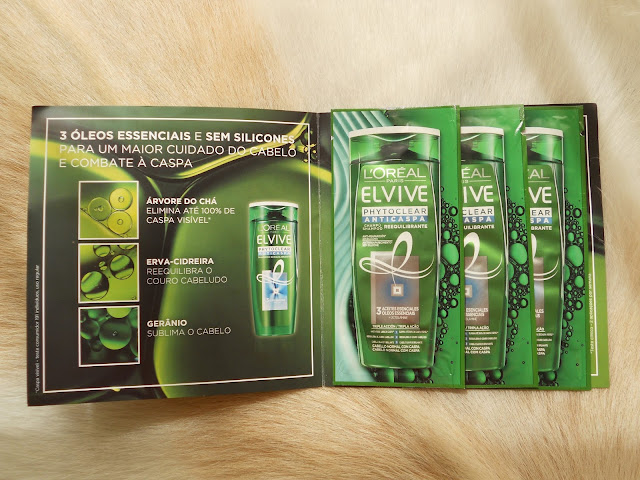 Da L'Oréal recebi a amostra que havia pedido do champô Phytoclear anti-caspa. O melhor foi que dentro da embalagem vieram três saquetas de champô. Fiquei bastante espantada porque por norma a oferta é sempre de uma saqueta única. Aconteceu com todos?!