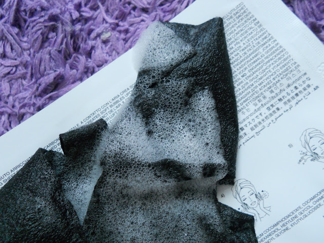 Passados os 15 minutos o aspecto da máscara é o que vêem abaixo. Muita espuma pela cara praticamente toda, embora com pontos mais concentrados. Serão zonas mais oleosas da minha pele e onde as bolhas entrarão em acção mais desenfreadamente? Não sei, só sei que gostei imenso do efeito da máscara na pele.