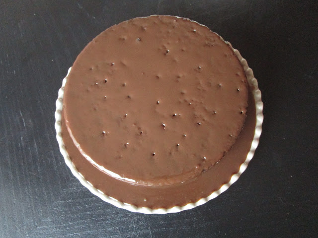 Eu antes de verter a cobertura, ainda piquei o bolo com um palito para que fosse ainda mais absorvida.
