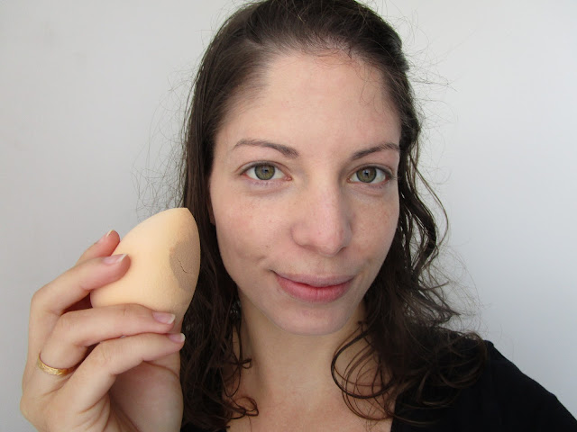Nunca aplico muito produto, porque com a sua média a alta cobertura, não quero que a pele fique demasiado artificial. Por norma uma dose da pipeta é suficiente. Hoje optei por esbater a base com a esponja de inspiração Beauty Blender, que como podem ver pelas fotos, já está a precisar de reforma (review aqui). Depois de esbater uniformemente a base, apliquei o corrector de olheiras da Cien, Lidl (post aqui), e voltei a usar a esponjinha. Adoro o acabamento que dá, sem grande trabalho. Para selar ambos os produtos líquidos, apliquei o Banana Powder da NYX que a A. me deu. Este pó compacto é muito fino e perfeito para um acabamento natural.